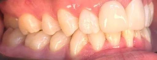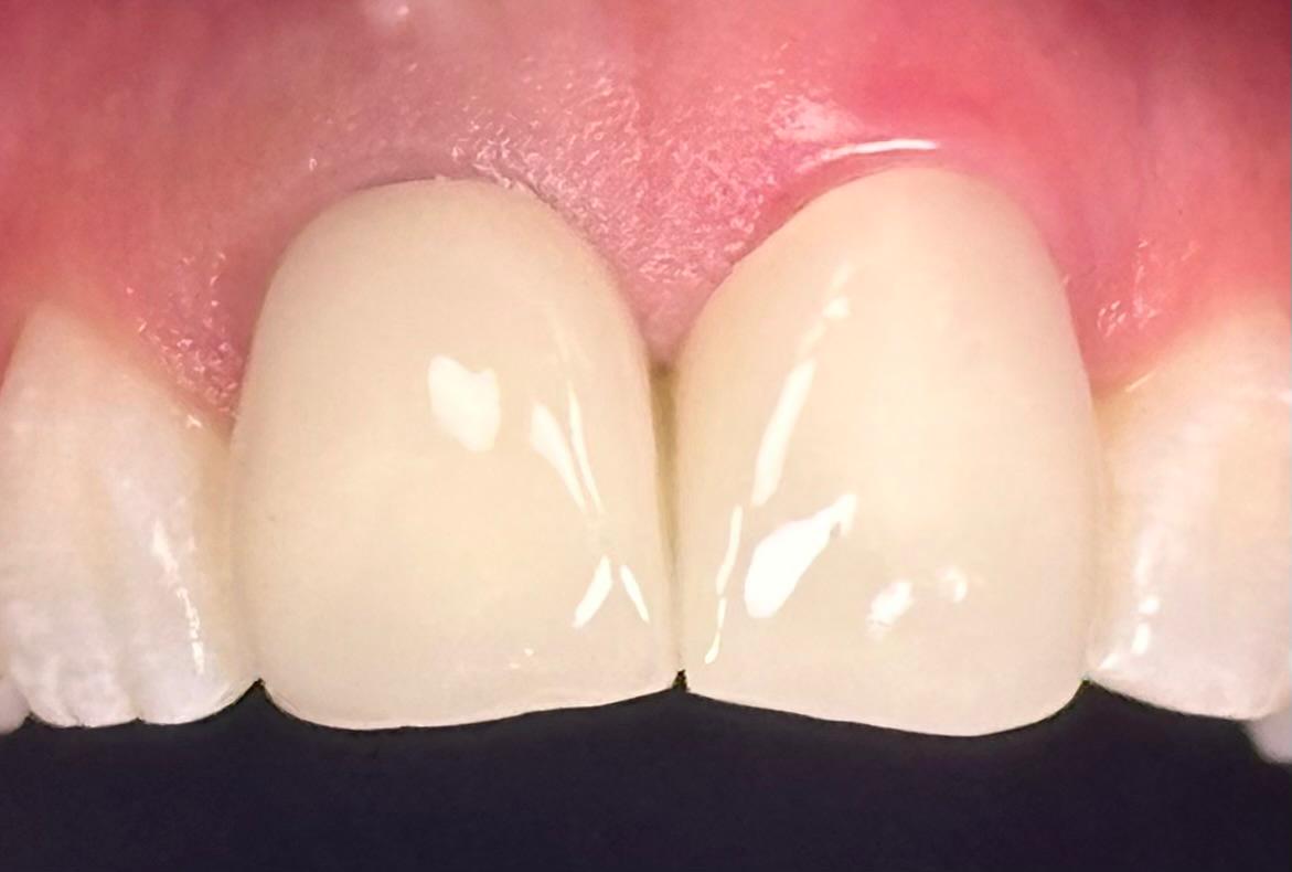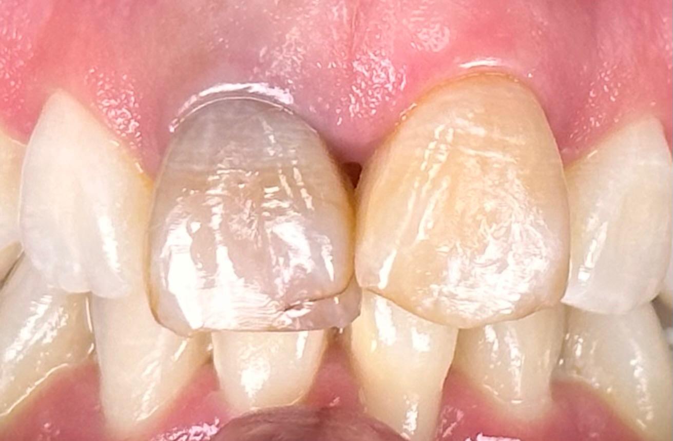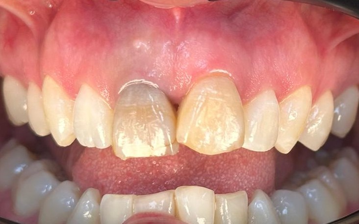 El desafío inicial: Un incisivo central con una tinción severa que comprometía la armonía y la luz natural de la sonrisa.