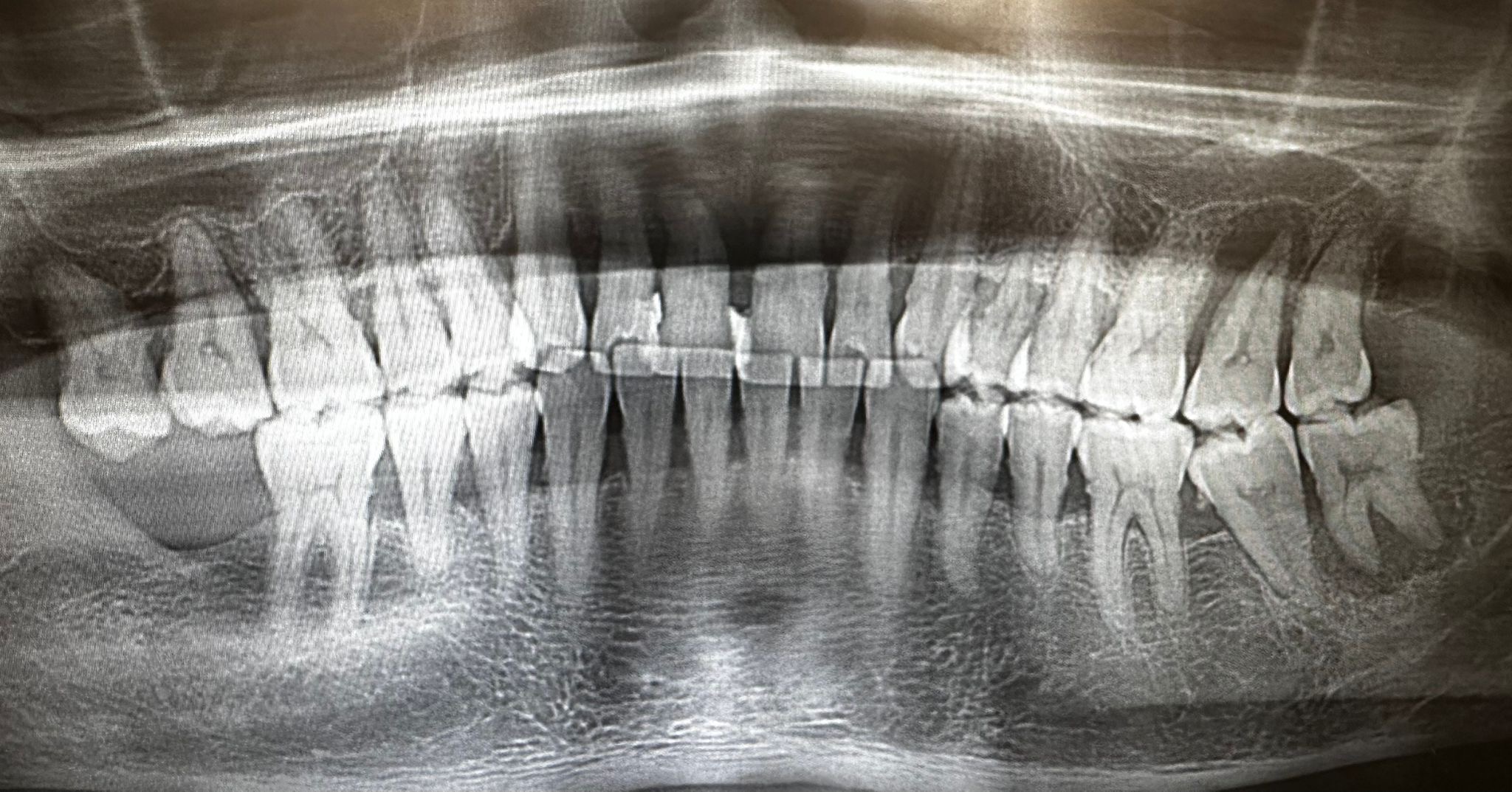 Ortopantomografía inicial. El diagnóstico radiológico confirma la pérdida masiva de soporte óseo en los incisivos superiores