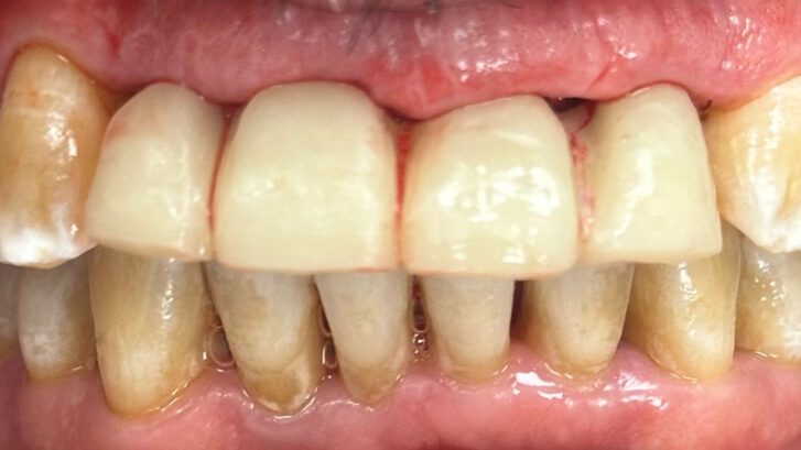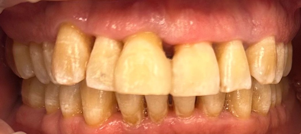 Situación inicial del paciente. Se observa una enfermedad periodontal avanzada con movilidad severa en el sector anterior y una estética muy deteriorada