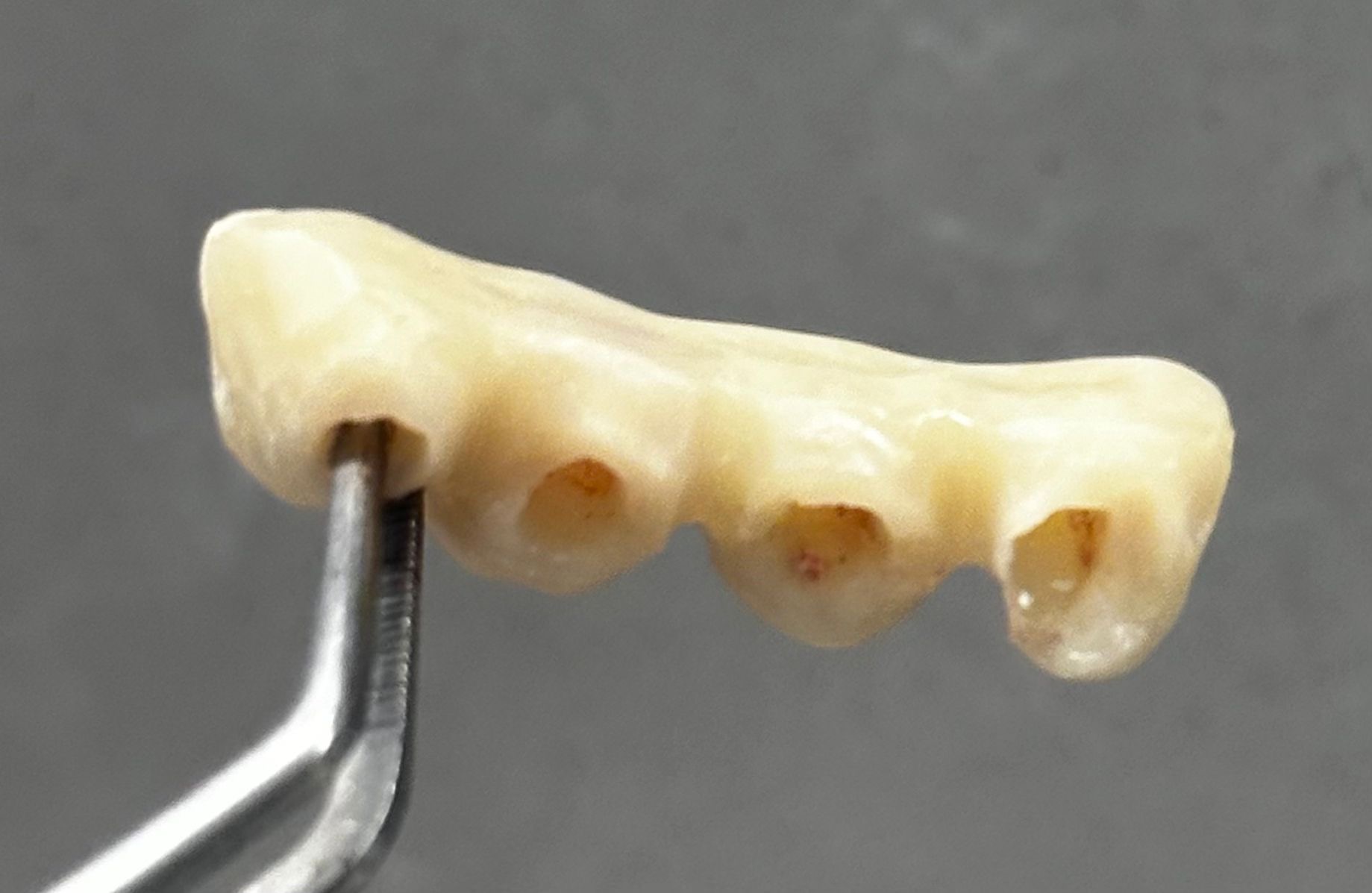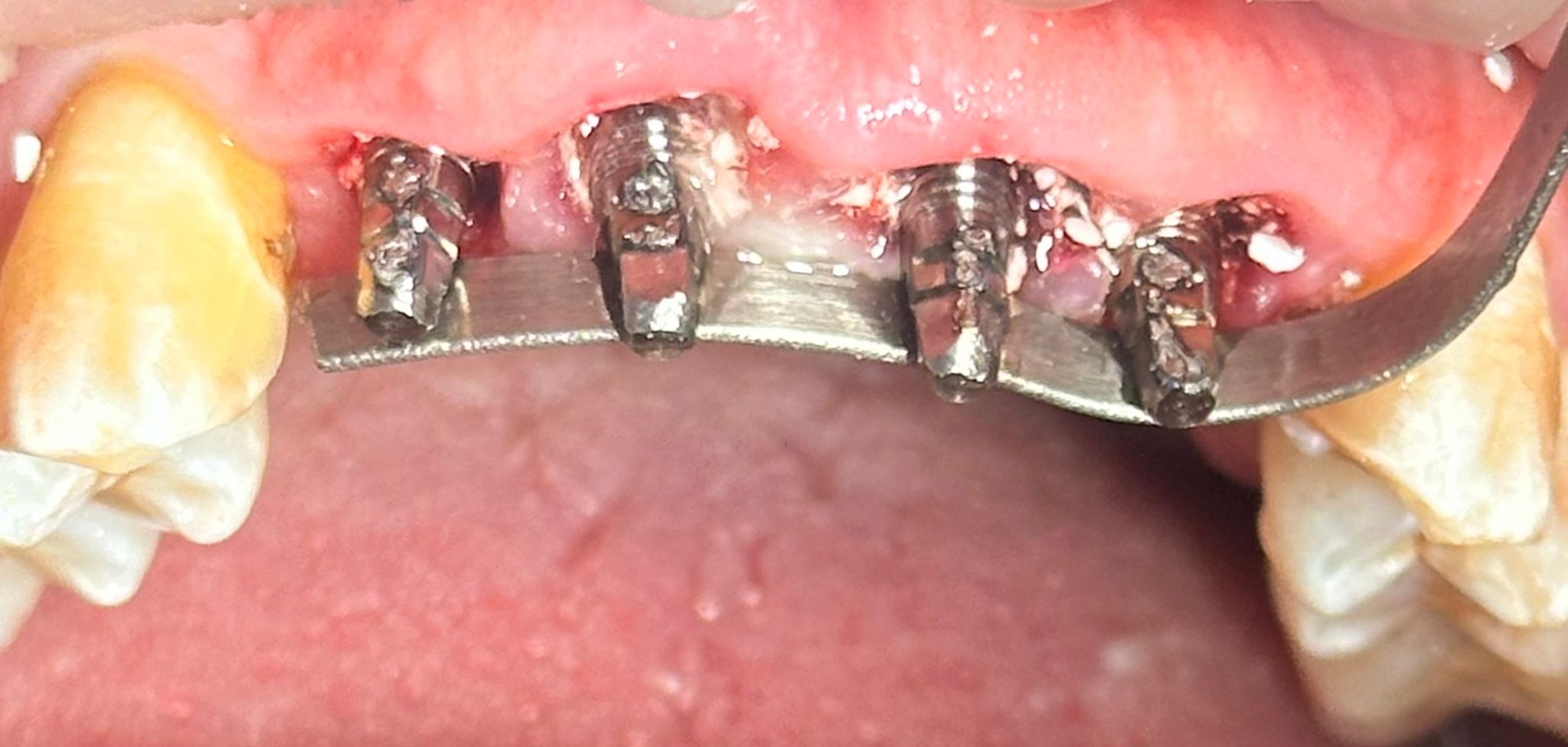 Realizamos la extracción de los cuatro incisivos superiores y, en el mismo acto quirúrgico, colocamos cuatro implantes de anclaje basal de 23 mm, buscando apoyo en el hueso cortical, el hueso más denso y estable. Además, se realizó una soldadura intraoral para rigidizar el conjunto y aportar máxima estabilidad desde el primer momento.