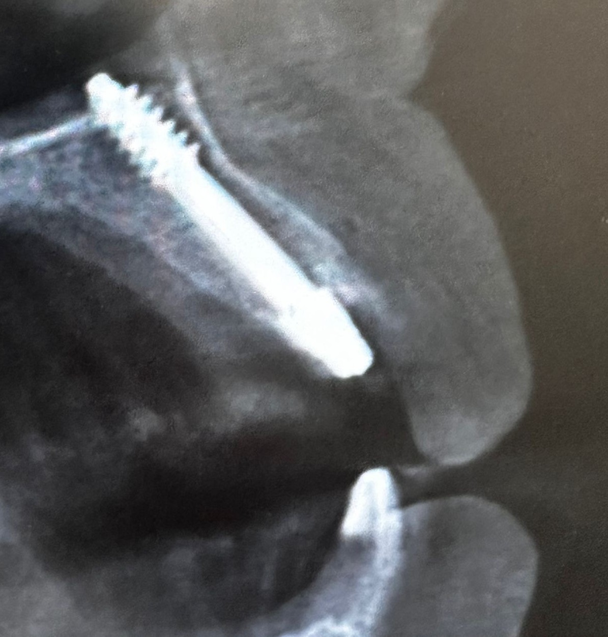 Detalle radiológico del implante basal. Los 23 mm de longitud permiten buscar el apoyo cortical, garantizando una estabilidad primaria excepcional